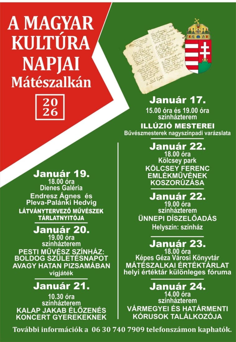 Mátészalka január 17–24. között színes programsorozattal ünnepli A Magyar Kultúra Napjait. Színházi előadások, koncertek, kiállítások és közösségi események várják minden korosztály érdeklődését.