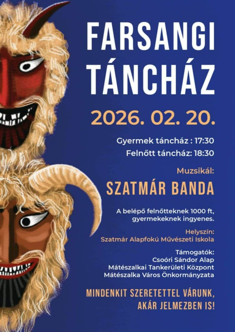 Farsangi Táncház várja a kicsiket és nagyokat 2026. február 20-án a Szatmár Alapfokú Művészeti Iskolában, gyermek- és felnőtt programmal. A jó hangulatról a Szatmár Banda gondoskodik, jelmezben érkezni kifejezetten ajánlott!