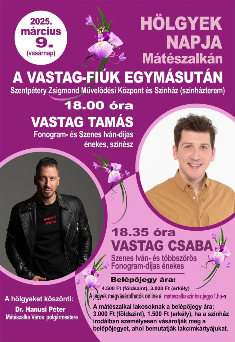 2025. március 9-én vasárnap a Szentpétery Zsigmond Művelődési Központ és Színház színháztermében 18.00 órától VASTAG TAMÁS Fonogram- és Szenes Iván-díjas énekes, színész 18.35 órától pedig VASTAG CSABA Szenes Iván- és többszörös Fonogram-díjas énekes gondoskodik arról, hogy felejthetetlen dallamokkal és fergeteges hangulattal töltsék meg az estét.