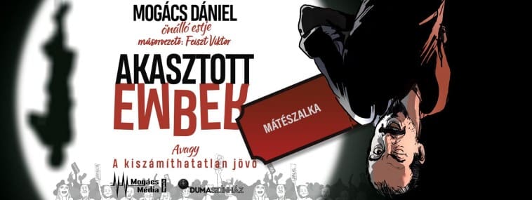 Frenetikus, stand-up, színház, báb és improvizációs előadás vár minden fekete humort értékelő szalkaira, akik megnézik Mogács Dániel önálló estjét november 8-án 18 órakor, a Szentpétery Zsigmond Művelődési Központ és Színházban! A szatirikus előadás az „Akasztott Ember” címet viseli, melynek során Mogács a világ problémáin nevetve, hátrakötött kézzel ugrik fejest az ismeretlenbe.