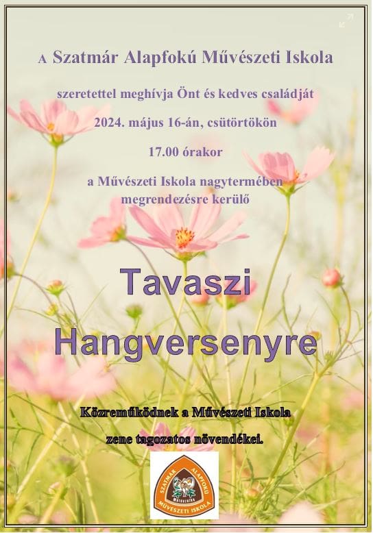 Tavaszi Hangversenyt rendez a Szatmár Alapfokú Művészeti Iskola 2024. május 16.-án, csütörtökön 17 órakor, a Művészeti Iskola nagytermében. Közreműködnek a Művészeti Iskola zene tagozatos növendékei.