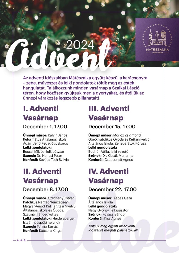 Az adventi időszakban Mátészalka a Szalkai László téren együtt készül a karácsonyra – zene, művészet és lelki gondolatok töltik meg az esték hangulatát. Találkozzunk minden vasárnap a Szalkai László téren, hogy közösen gyújtsuk meg a gyertyákat, és átéljük az ünnepi várakozás legszebb pillanatait!
